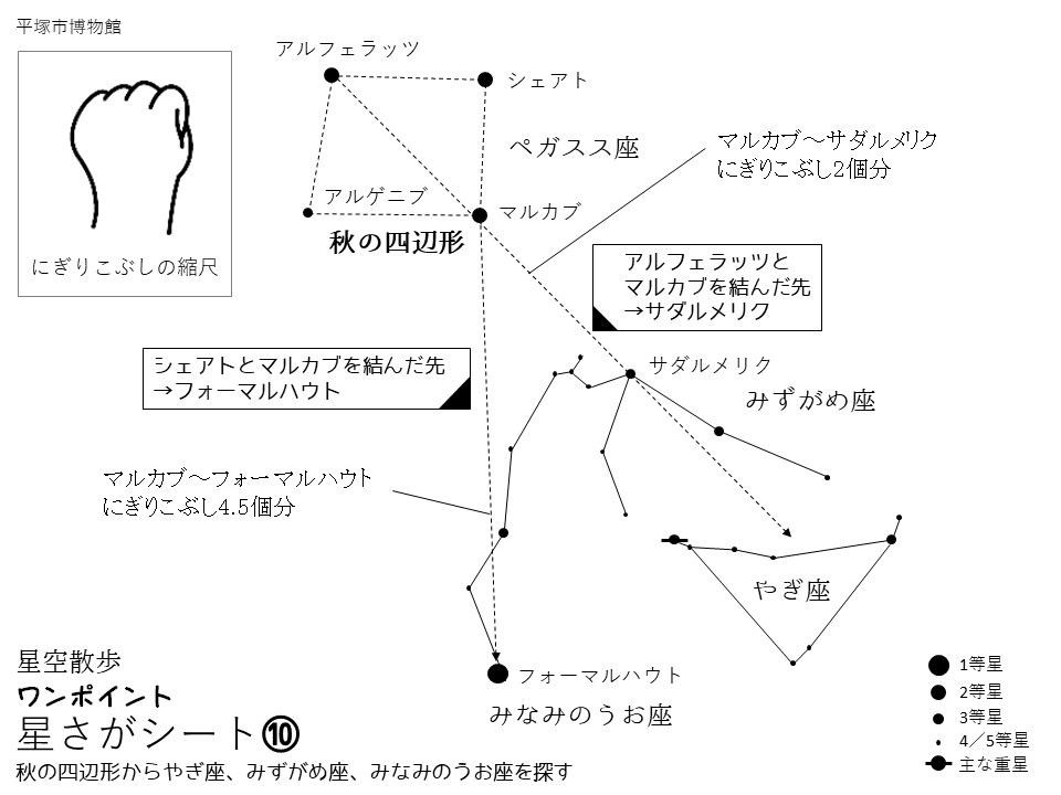 宵の空を見上げると、天頂を挟んで西側に夏の大三角が、東側に秋の四辺形を見つけることができます。秋の四辺形は夏の大三角に比べるとやや目立たないのですが(1等星がない)、秋の星や星座を探すのにはたいへん便利なアステリズムです。例えば、秋の四辺形の西側の辺を南へ伸ばすと、秋の星座唯一の1等星フォーマルハウト(みなみのうお座)を見つけることができます。また、北東→南西の対角線を南西に伸ばせば、やぎ座の三角形を、秋の四辺形とやぎ座の間にはみずがめ座をみつけることができるのです。