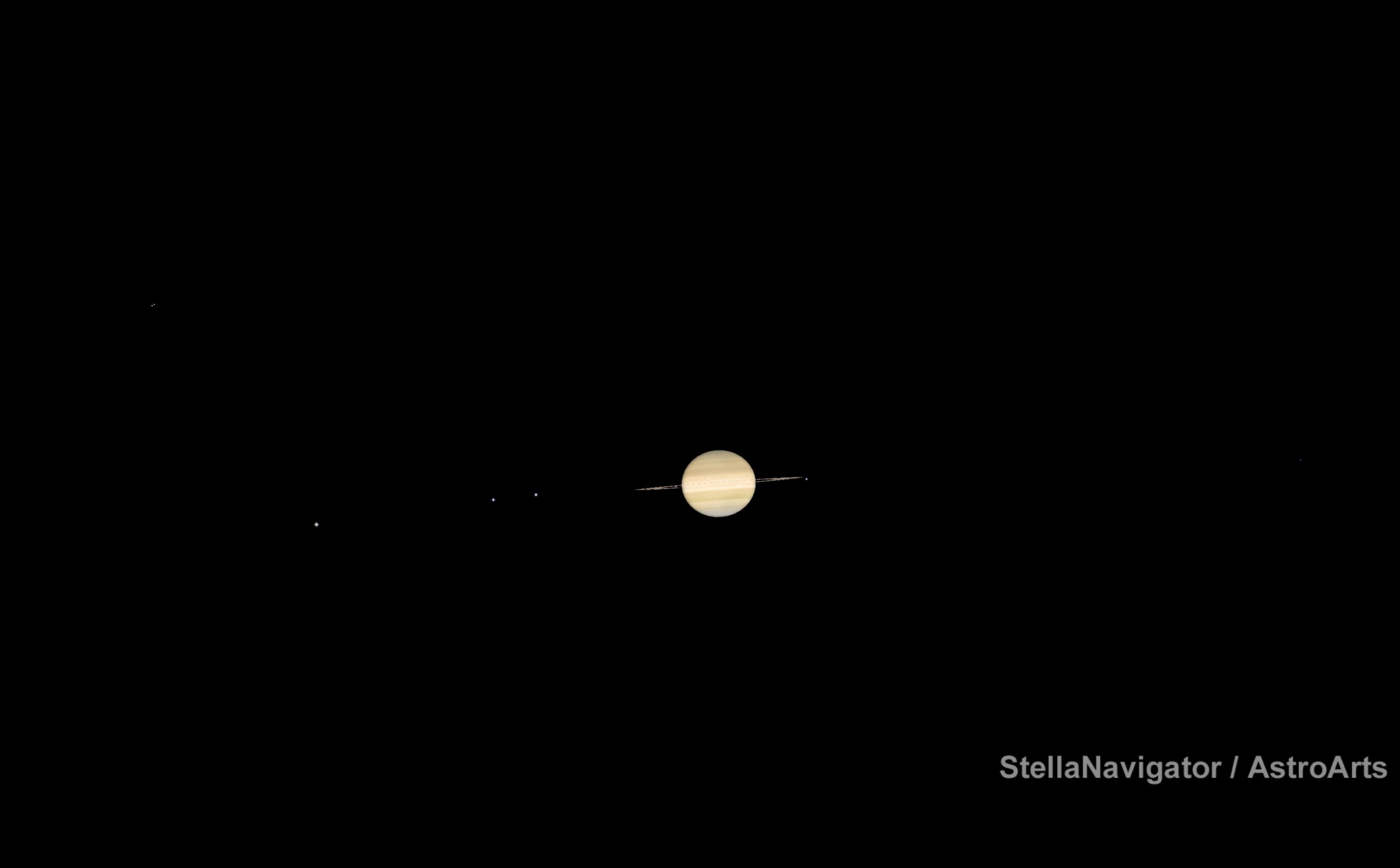 土星はほぼ一晩中、見ることができます。15年に一度の環が細い土星、ぜひ機会を見つけて望遠鏡で見てみてくださいね!下の画像はステラナビゲータ/AstroArtsでシミュレートした2025年10月15日20時の土星の姿です。