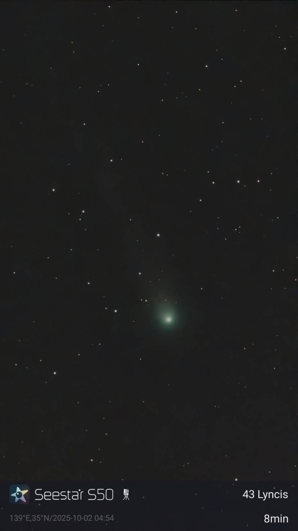 今年1月に発見されたレモン彗星(C/2025 A6)。8月に急激に明るさを増し、肉眼彗星になるのではと期待されています。とはいえ彗星とは元来ぼんやりと見えるもの。たとえ4等級になったとしても、同じ明るさの恒星(4等星)より見にくいです。なるべく空が暗いところで、かつ双眼鏡などを使って見たいところです。10月15日頃までは明け方の東の空に、それ以降は夕方の西の空にも見えるようになります。10月も終わりに近づけば近づくほど明るくなる予報です。詳しくは、また博物館日記で取り上げたいと思います。ご期待ください。下の画像は当館天体観察会会員の水永仁さんが10月2日早朝に撮影したレモン彗星です。