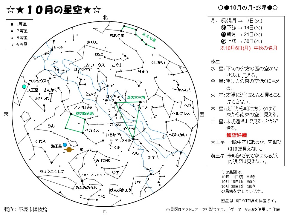 昨日から10月になりました。ようやく残暑がおさまって涼しくなってきた感じでしょうか。「天高く馬肥ゆる秋」という諺があるように、秋晴れが広がる日が多い10月は星を見るのに適した季節。ぜひ夜空を見上げてみてください。