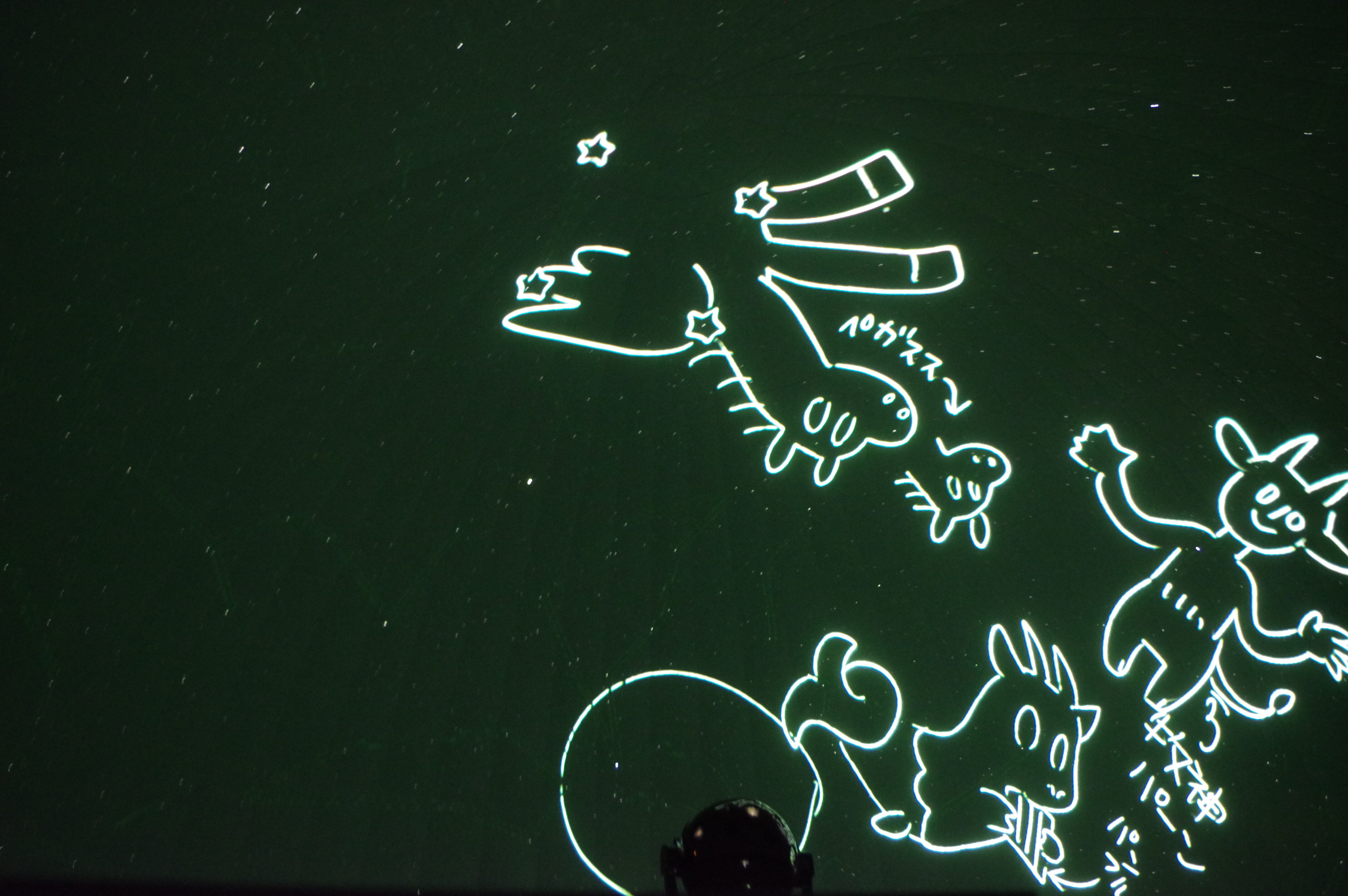 今回、八王子さんが挑戦したのはライブペインティング!なんとその場でプラネタリウムのドームに星座の絵をお絵描きしたのです。星座のお話をしながら!これって本邦初じゃないでしょうか!?