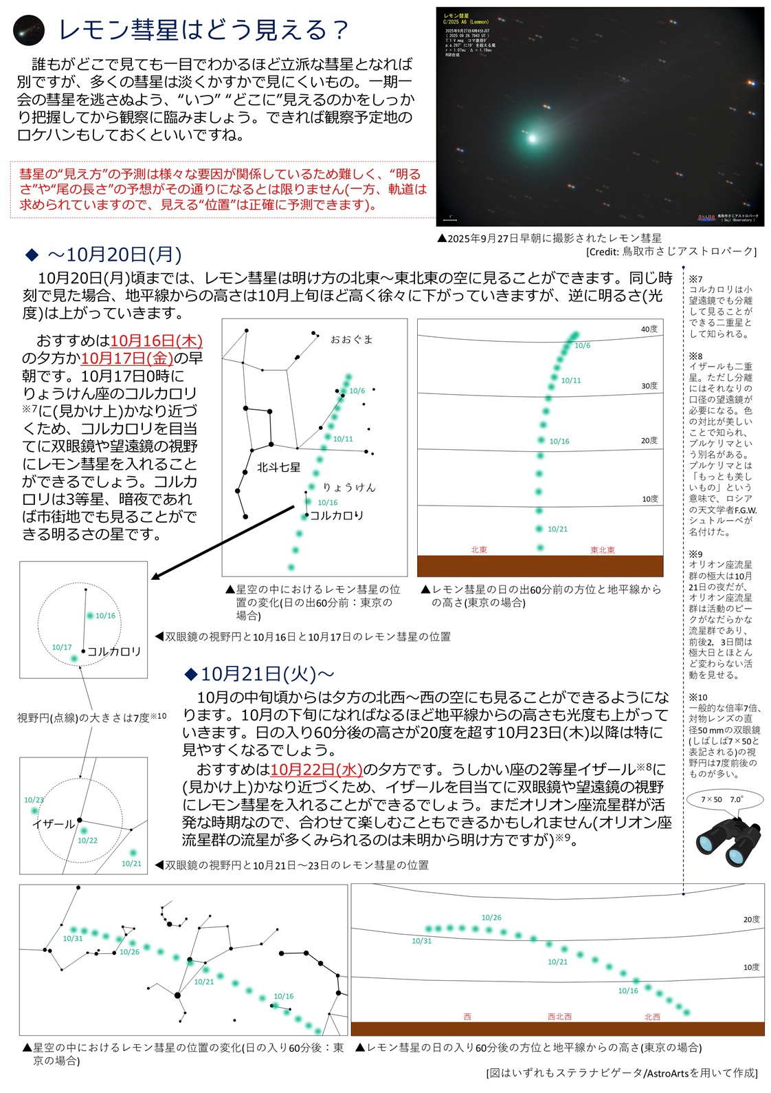 というわけで、レモン彗星の見える時刻・位置や観察方法は、ポスター(上の画像)をご覧ください。