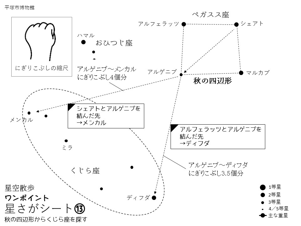 秋の四辺形の西側の辺を南へ伸ばすと、みなみのうお座のフォーマルハウトを見つけることができる、ということを先月ご案内しましたが、逆の辺、すなわち秋の四辺形の東側の辺を南に伸ばすと、くじら座の2等星ディフダ(デネブカイトスとも)を見つけることができます。一方、秋の四辺形の北西→南東の対角線を伸ばすとくじら座の頭を見つけることができますから、これでくじら座の全容を大まかに掴むことができるでしょう。