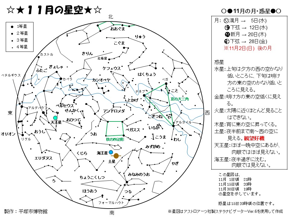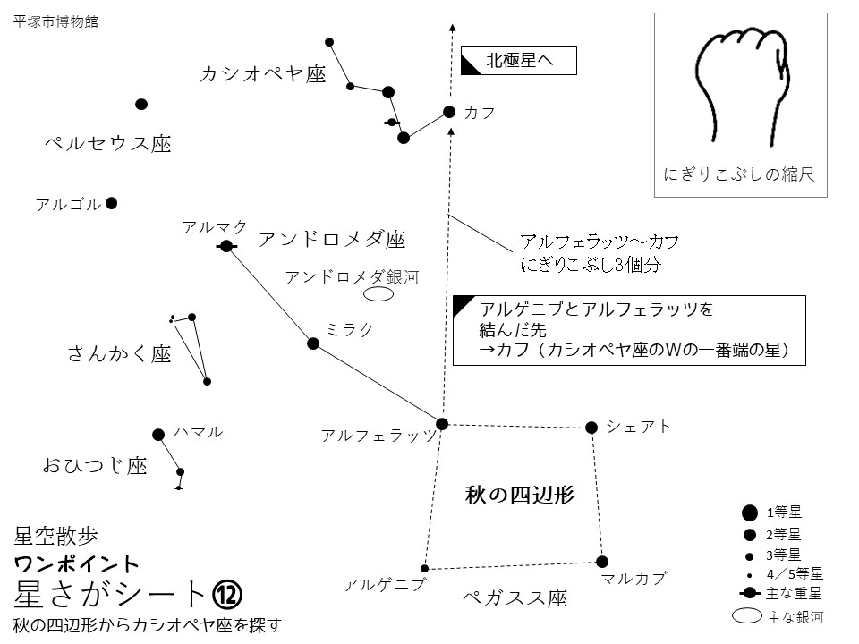 また、同じ辺を北に伸ばすとカシオペヤ座のW字形の端の星を見つけることができ、さらに伸ばしてくと北極星に達します。さらに秋の四辺形を柄杓の合(水を入れるところ)に見立てるように北東に向かって明るい星をたどるとアンドロメダ座を見つけることもできます。