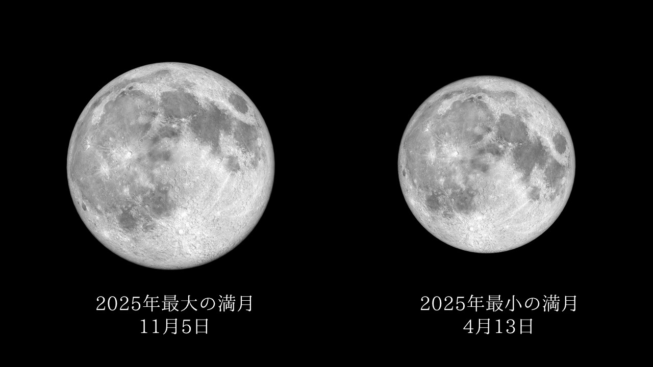 地球と月の間の距離は一定ではありません。年間を通じて最大4万kmほど変化します。地球-月間の平均距離はおよそ38万kmですから10%近く変わることになります。地球に近い月は大きく、遠い月は小さく見えます。同時に見て比較することができないのでその変化を実感することはほとんどできませんが、実は“最近”の満月と“最遠”の満月とではけっこう大きさが違うのです。同じ条件で写真を撮って比較してみるのも楽しいかもしれません(2026年最小の満月は5月31日です)。