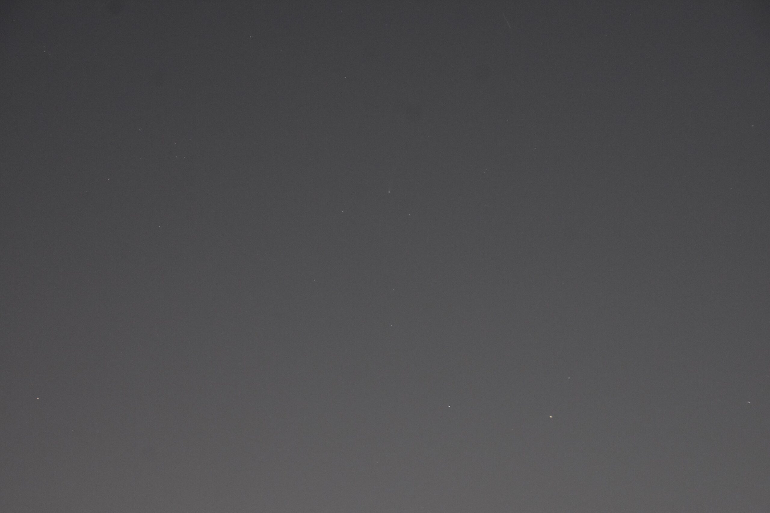 ですが……写真にはあまり微かにしか写りませんでした。空の明るさが完全には消えていなかったこと、月明りがあったこと、晴れているように見えて少しもやがかかっていたかもしれなかったこと、などが原因かもしれません。いちおう、いちばん良く写っていた写真をアップロードしておきます。レモン彗星、どこに写っているか、わかりますか?