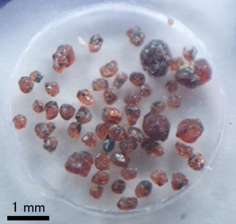 ざくろ石とも呼ばれるガーネットは、球に近い形をした赤や緑の鉱物です。なかでもおよそ250万年前、丹沢山地で起きた噴火で舞い上がった火山灰の中には、1mmにも満たない小さな赤いガーネットが大量に含まれています。その火山灰の中から赤いガーネットを探し出して標本をつくっていただきます。