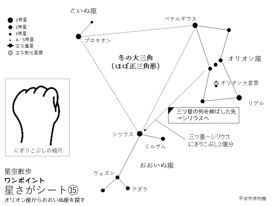 オリオン座やその一部である三つ星には多くの”和名”があります。もっともひろく人口に膾炙しているのは「つづみぼし」ではないでしょうか。オリオン座の主要な星ならびを楽器の鼓に見立てたものですね。ほかにも地方によってたくさんの呼び名があるのですが……ここでは紹介しきれないので、興味がある方はぜひ当館令和4年度秋期特別展「星になった民具たち」図録をご覧ください。絶賛、頒布中(笑)