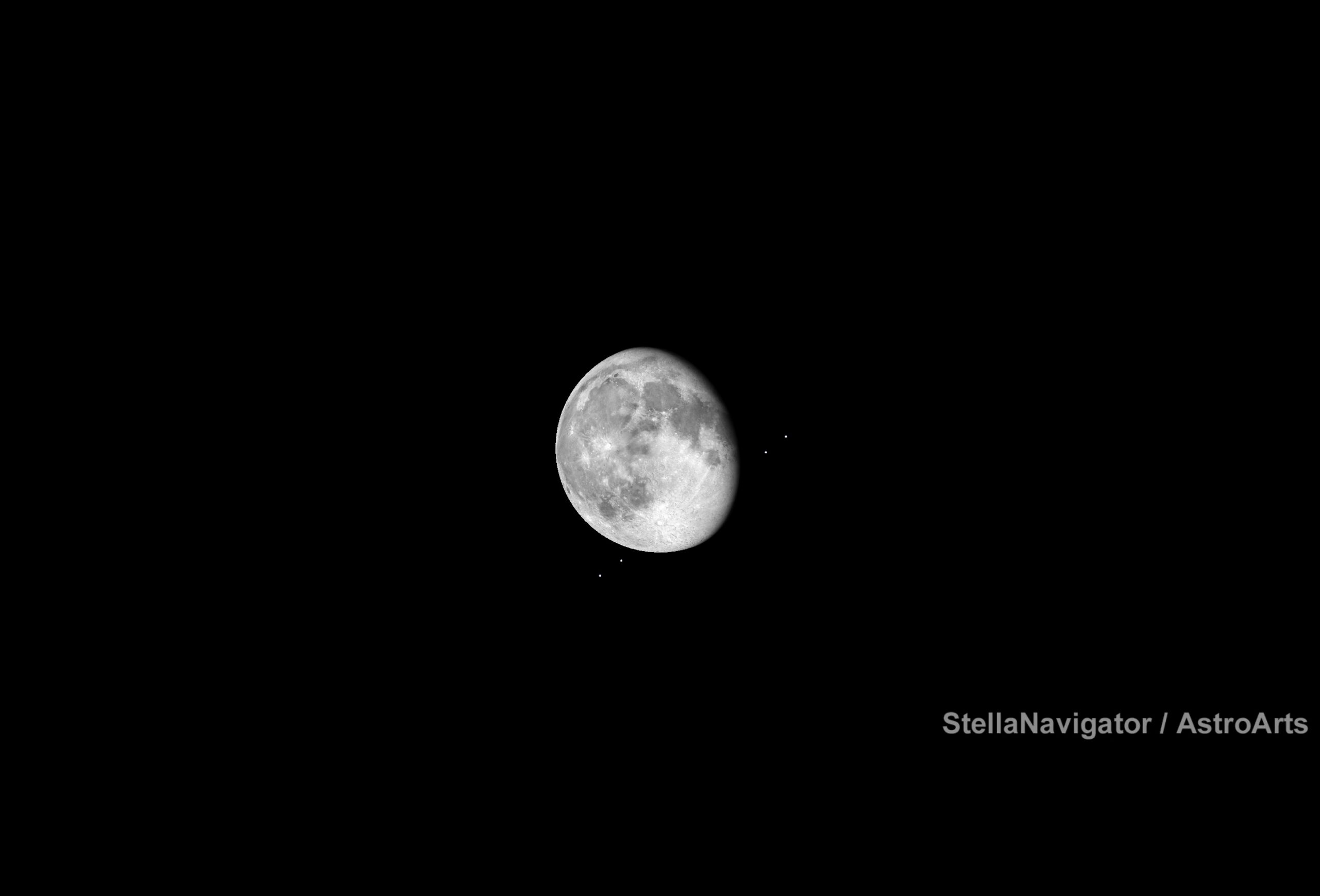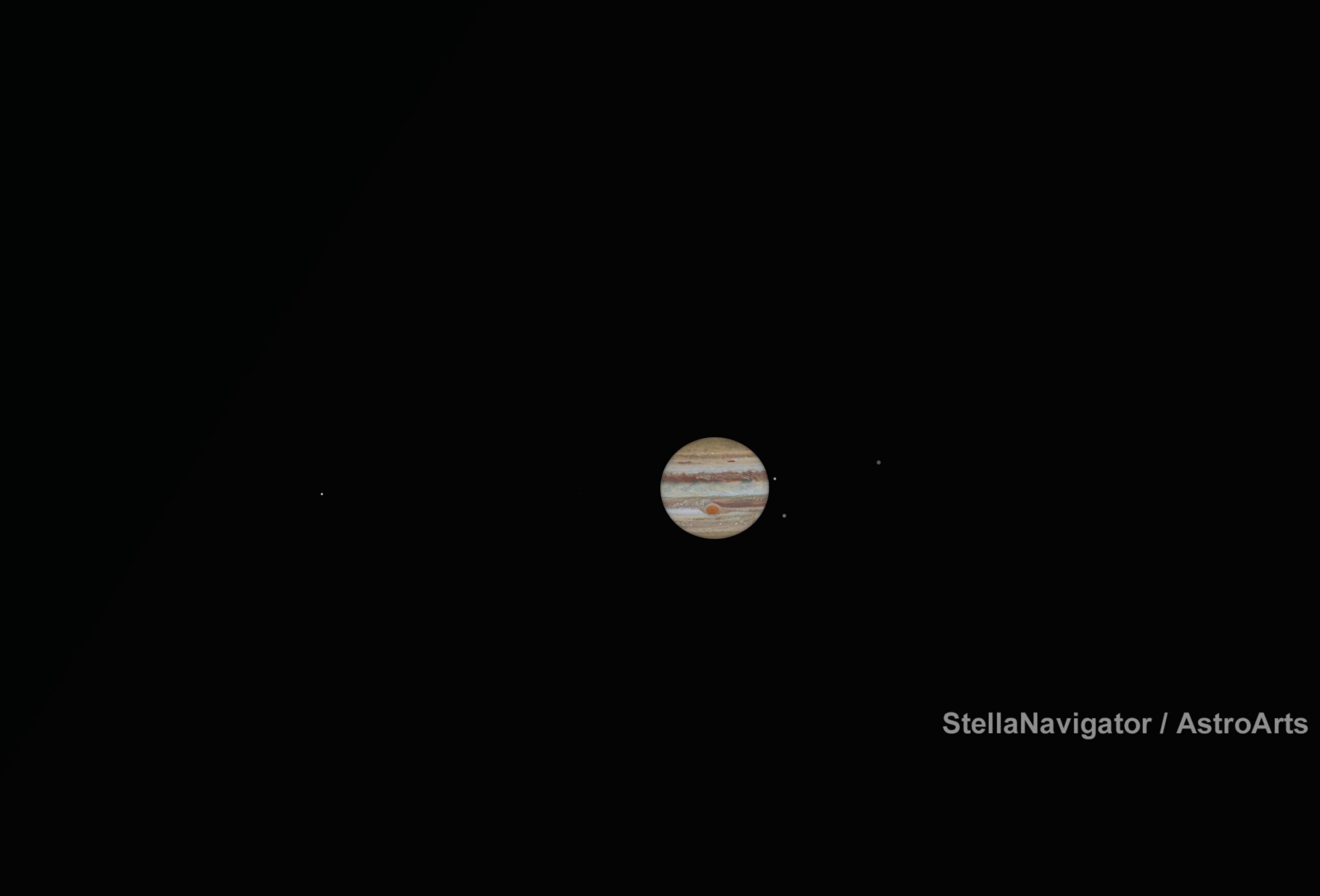 衝とは、惑星が地球から見て太陽とは反対方向に位置することを言います。月で言えば満月にあたり、一晩中見えることになります。そしてこの日以降、徐々に昇る時刻が早くなっていき、宵の空で見やすくなっていくのです。なので、1月10日にこだわる必要はありませんが、今月から春先にかけて、木星が見頃というのを覚えておいてください。下の画像はシミュレーションソフトで描画した2026年1月10日21時の木星の様子です。