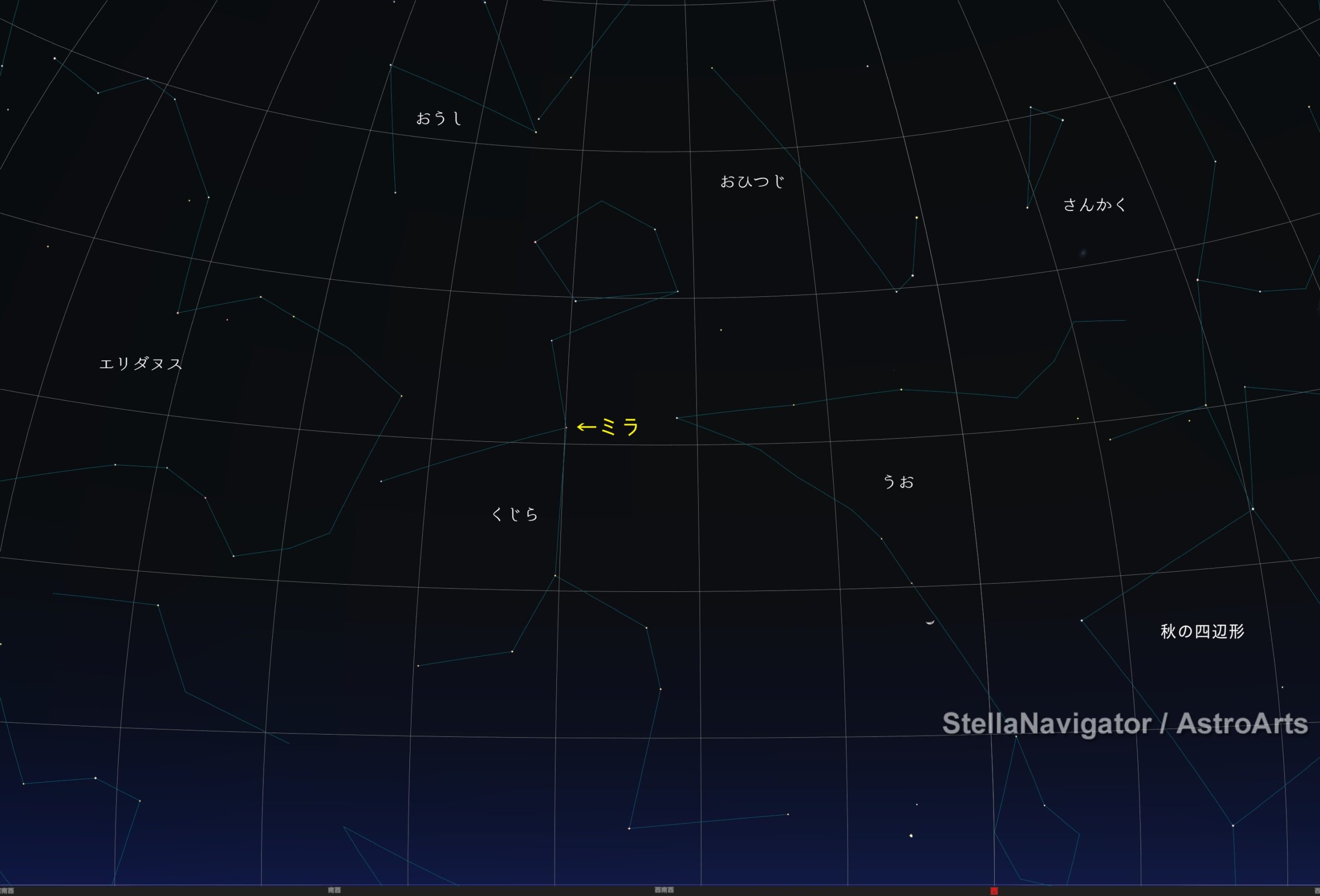とにもかくにも、1月の下旬にはミラが肉眼で見えるようになっていることでしょう。肉眼で見える期間はそんなに長くありませんので、ぜひ一度は見てみてください。宵のころ、南西~西南西の空に見ることができます(下の画像は2026年1月24日21時の空)。