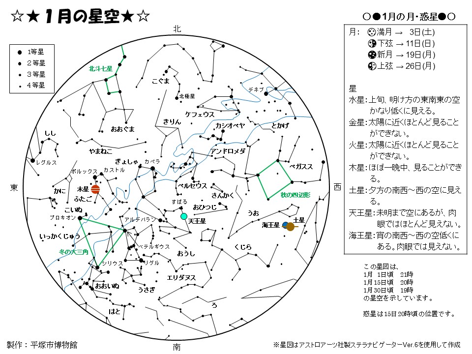 さて、寒さが一段と厳しくなる1月ですが、西高東低の冬型の気圧配置となれば、日本海側の皆さんには申し訳ないですが、平塚はよく晴れる日が続きます。寒さ対策は必須ですが、星空はきれいに見える季節。ぜひ夜空を見上げましょう。