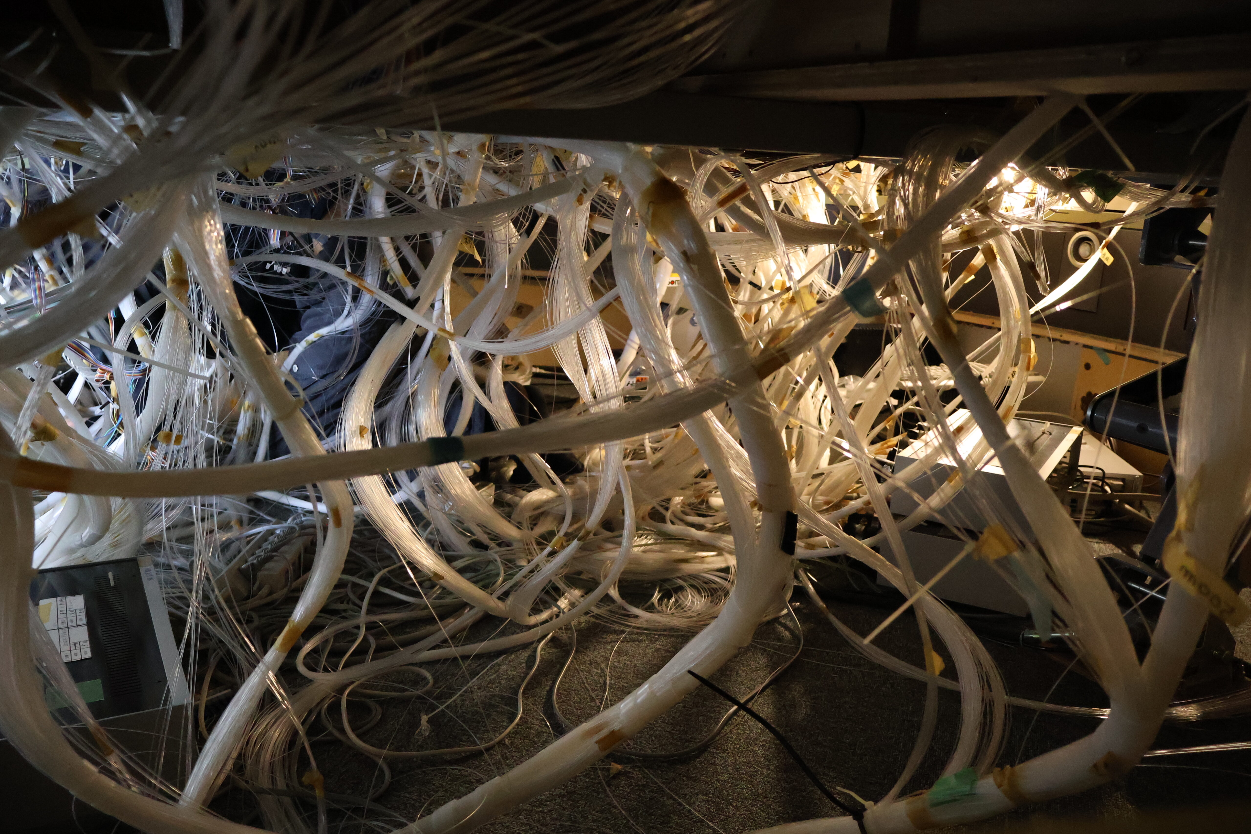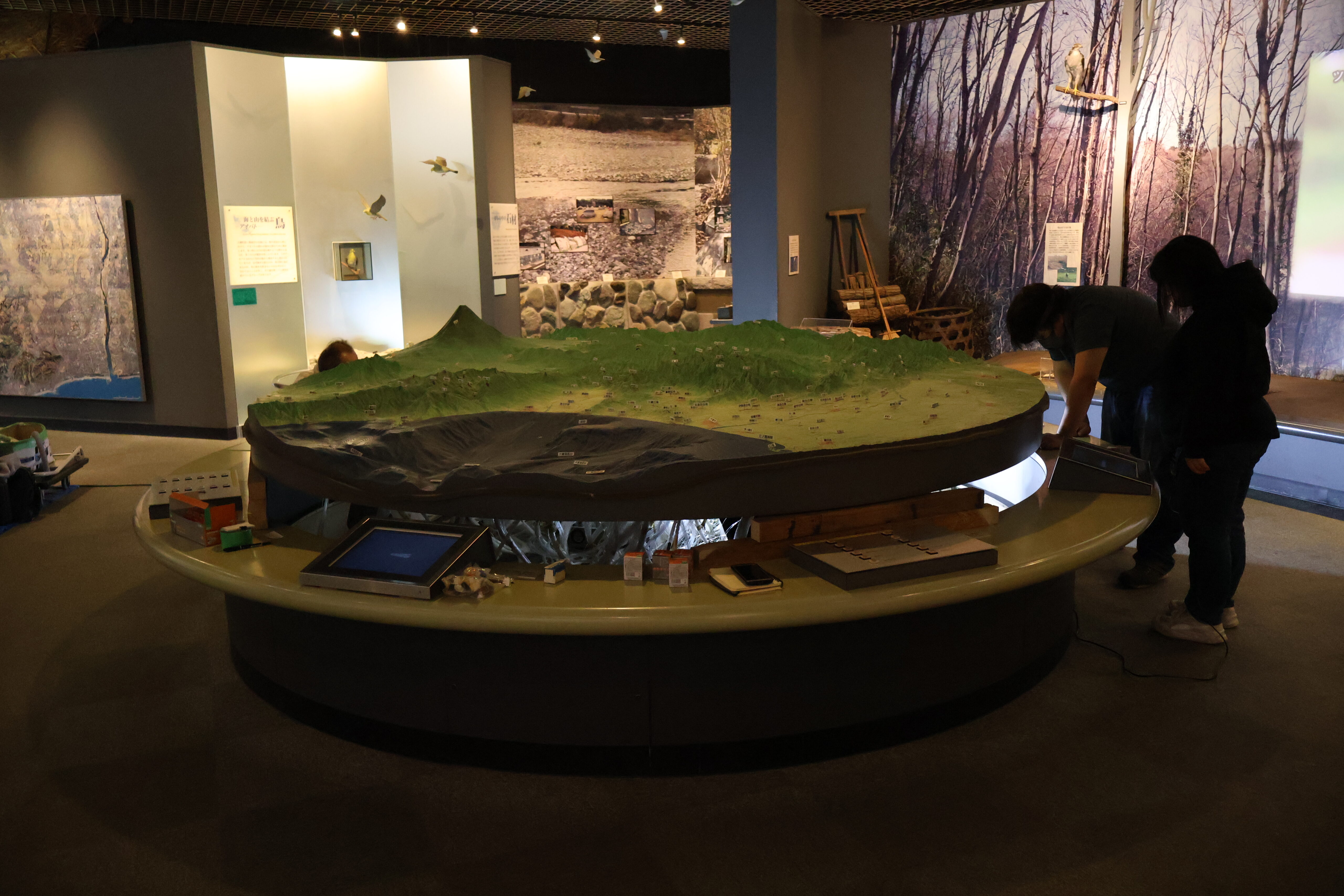 当館では年に一度、休館日を利用して常設展示の保守点検・修繕を行っています。上の写真は地形模型の点検の様子。地形模型はジャッキアップして中の配線等の確認や、演出照明の確認と調整が必要となります。