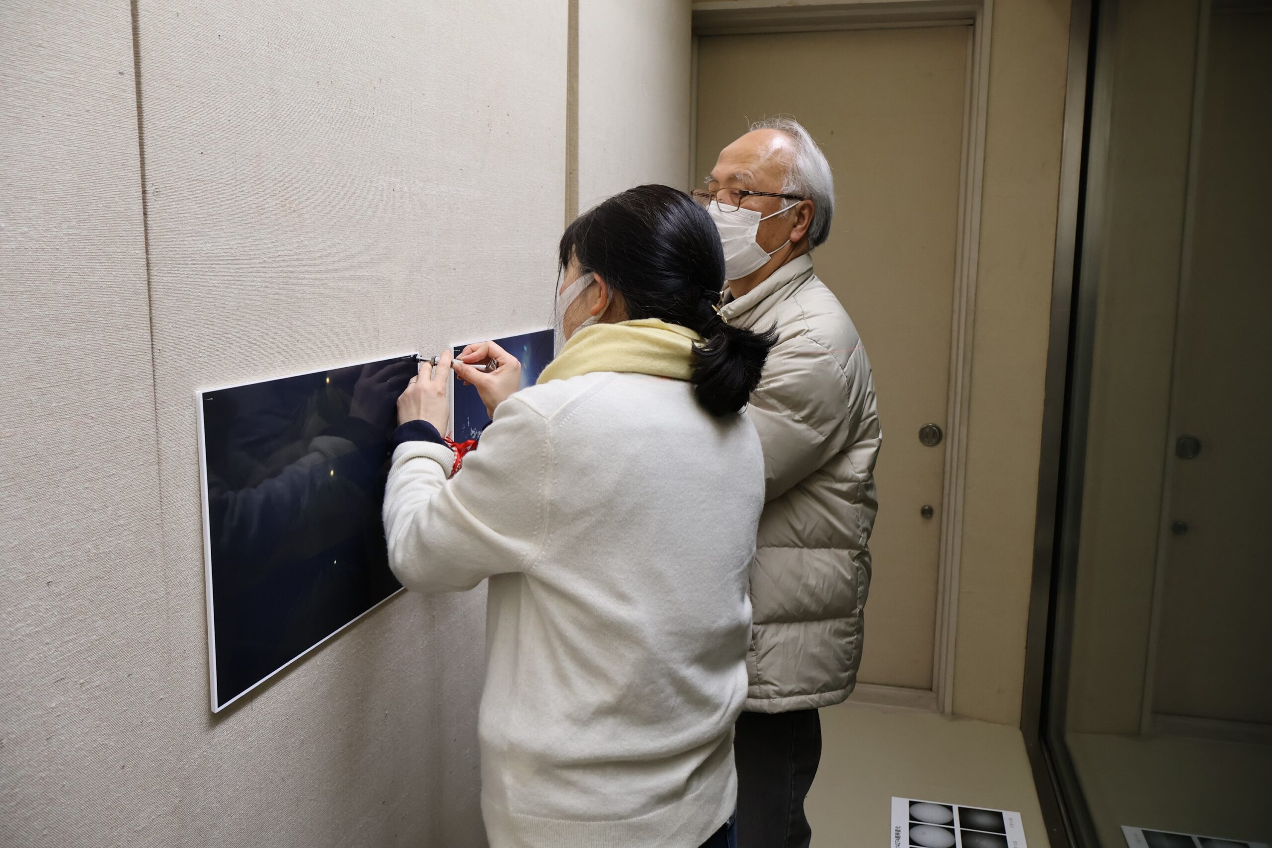 その後、パネル化された天体写真に両面テープを貼ったり、天体写真を展示ケース内壁に掲示しピン止めをしたり、作業が進みました。