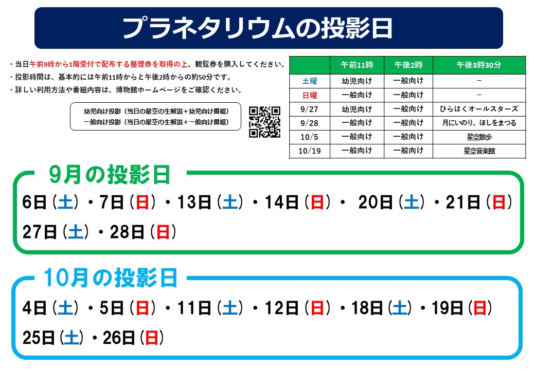 ・投影時間は約50分で、前半は当日見える星空についてのお話、 後半は天文学や宇宙開発に関するテーマについての番組投影 or 解説です。