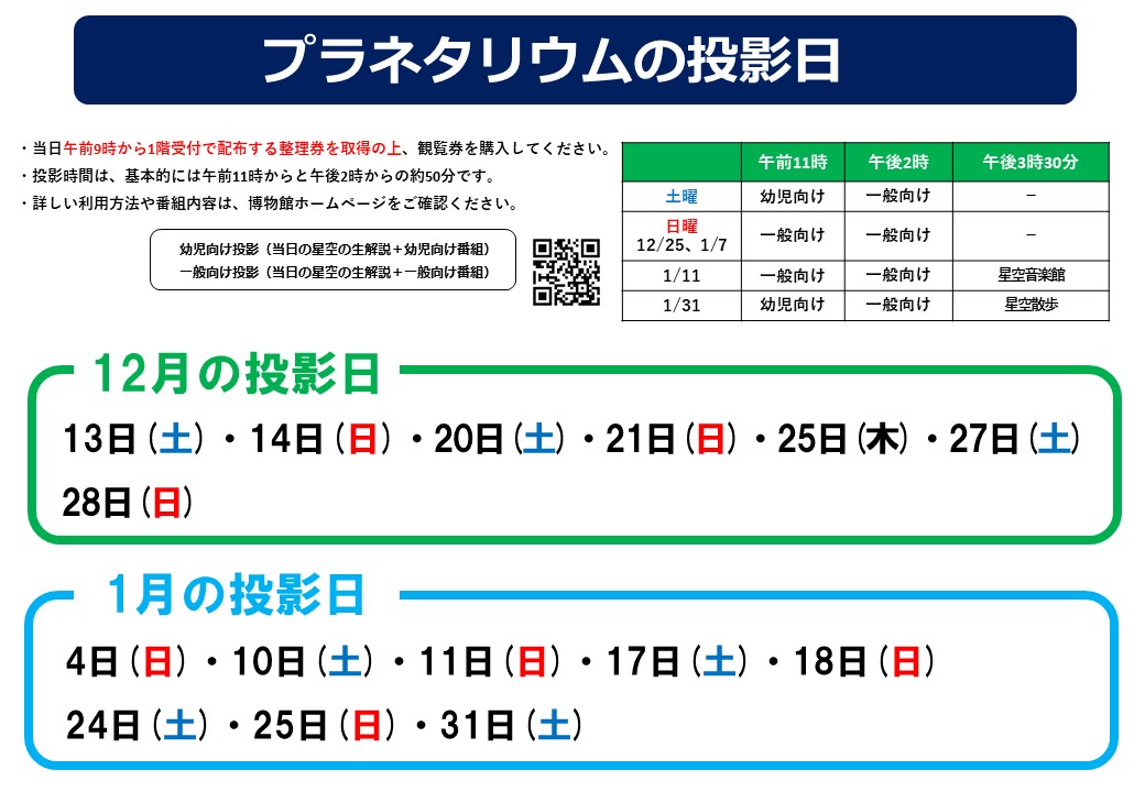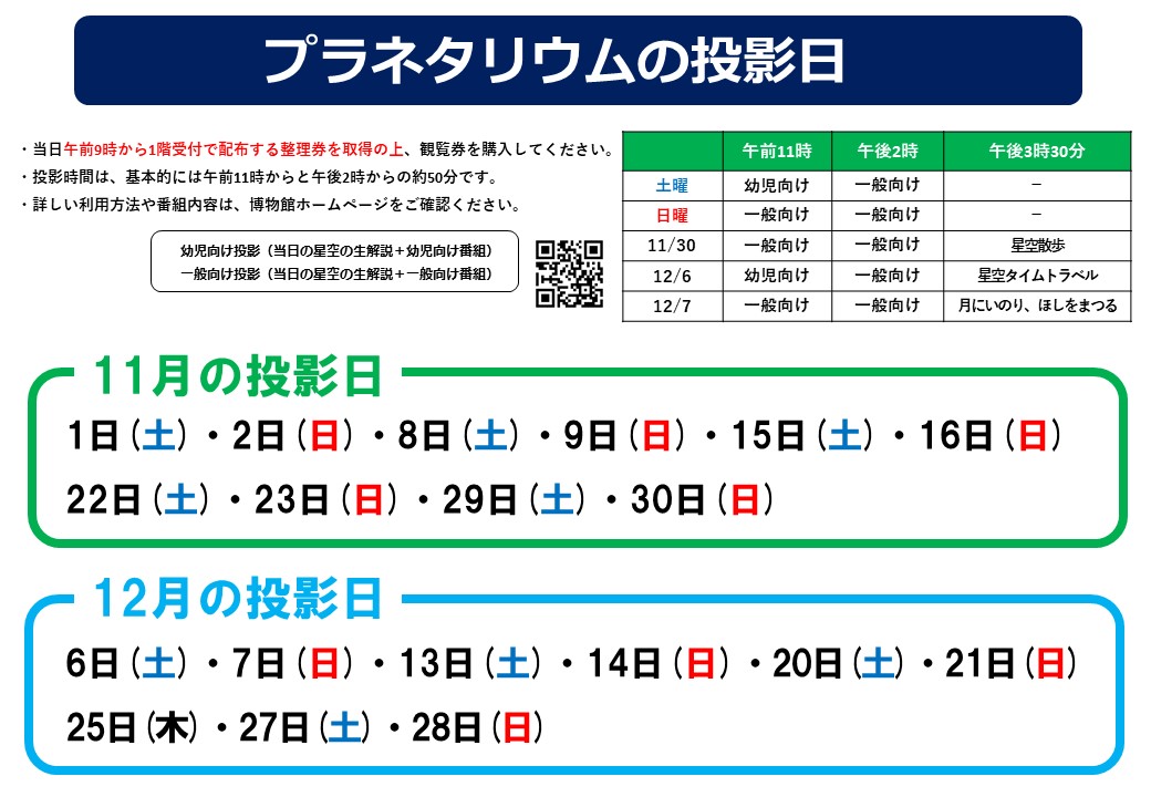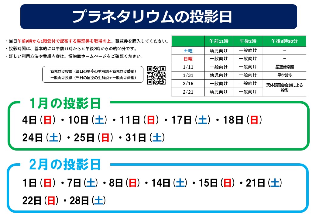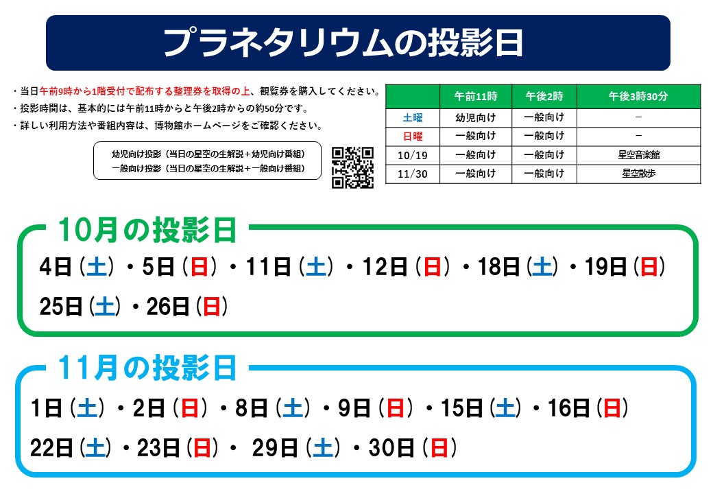 ・投影時間は約50分で、前半は当日見える星空についてのお話、 後半は天文学や宇宙開発に関するテーマについての番組投影 or 解説です。